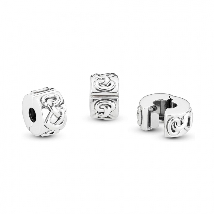 Notre charm clip Pandora Moments, simple mais époustouflant, est orné d'une rangée de cœurs noués. Le design combine le cœur emblématique avec le nœud d'amour classique, ce qui apporte une touche émotionnelle supplémentaire à cette pièce. La breloque en argent sterling est parfaite pour donner une touche d'amour à votre collection de bracelets, en plus d'aider à séparer uniformément l'ensemble des breloques. Cette breloque clip n'a pas de grip en silicone, elle glissera donc si deux entretoises de breloque en relief ne sont pas portées sur les fils.