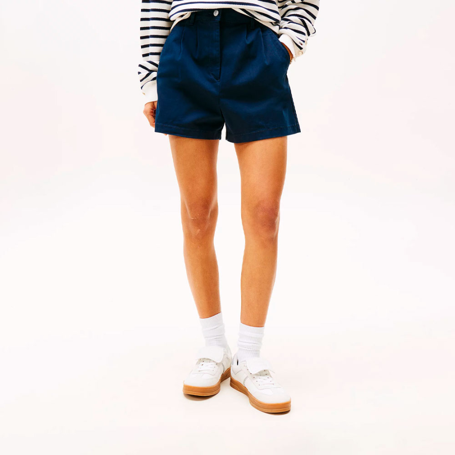 Ce short en jean taille haute avec plis sur le devant présente une silhouette de style marin vintage très flatteuse.
