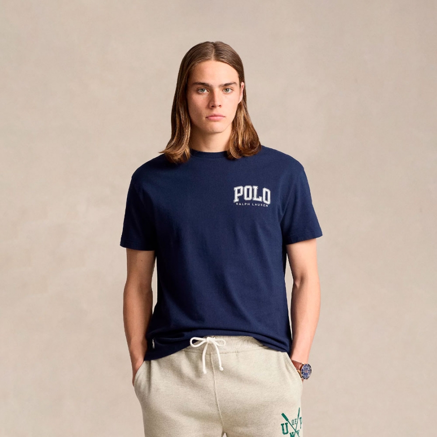 Ce t-shirt à bordure en coton présente le cheval brodé emblématique et le logo imprimé sur la poitrine en lettres majuscules de style universitaire.