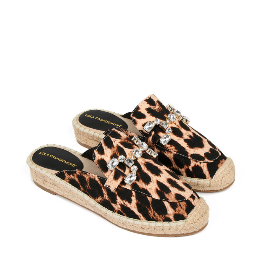 Espadrillas basse realizzate in tessuto leopardato con fibbia decorata con cristalli.